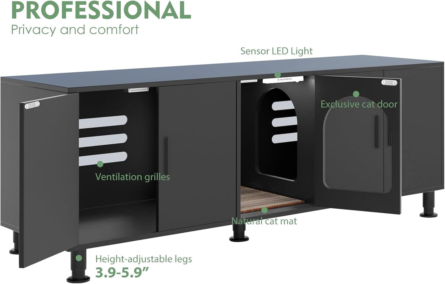 Amunrbrek Double Litter Box Enclosure Cabinet – 2-Cat Hidden Furniture with Motion Light & Cat Door
