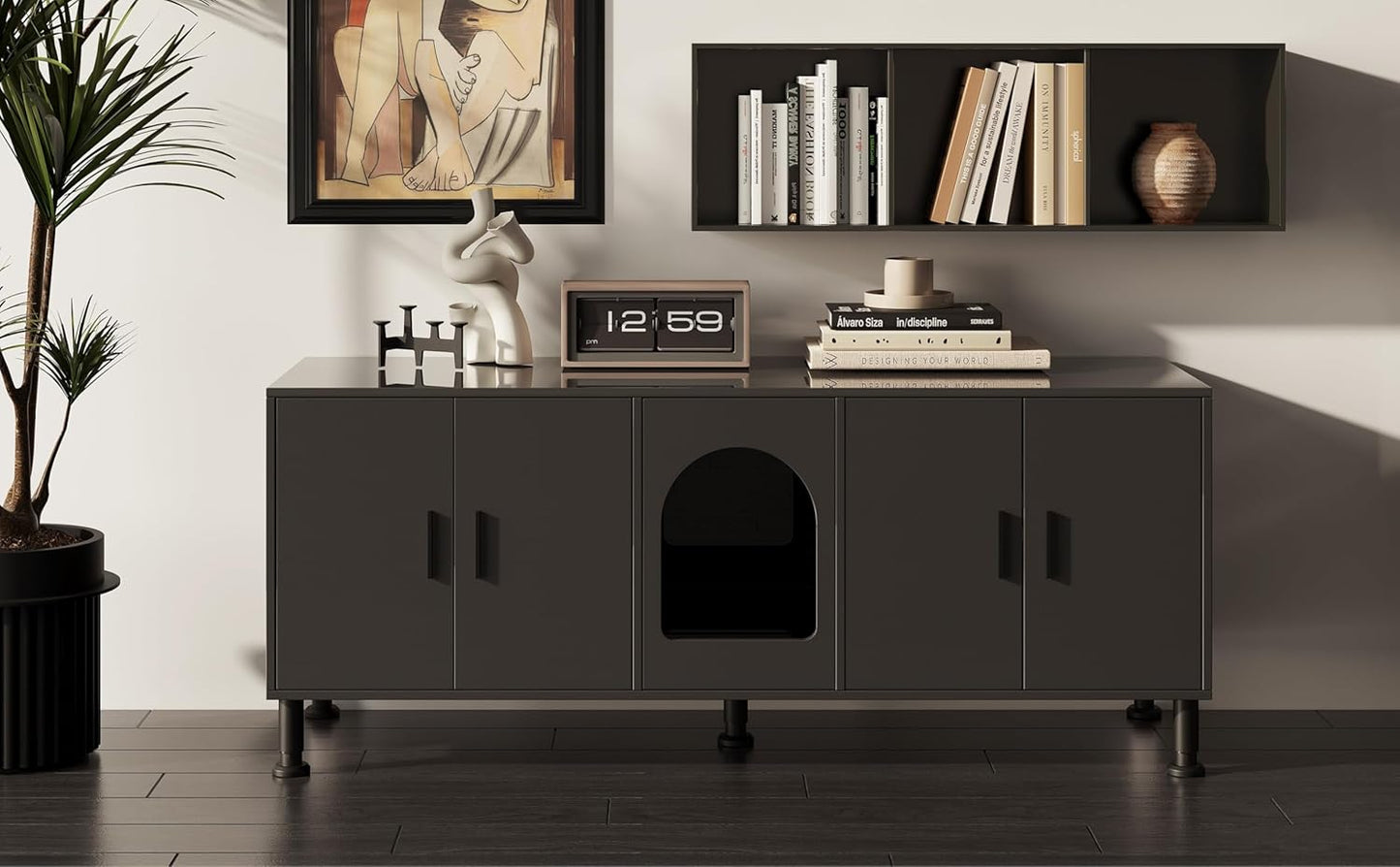 Give your cats more privacy while keeping your home clean and modern with the Amunrbrek Double Litter Box Enclosure Cabinet. Designed for two litter boxes, this sleek black cabinet hides mess, controls odor, and doubles as functional home furniture. With features like a built-in cat door, motion sensor lighting, and adjustable legs, it’s the perfect solution for multi-cat households.