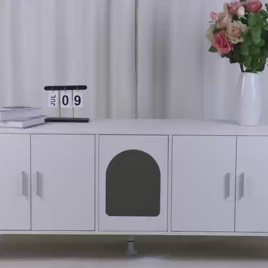 Ideal for multi-cat homes, the Amunrbrek Double Litter Box Enclosure Cabinet is designed to discreetly hide two litter boxes while delivering modern style, functionality, and comfort. With a clean minimalist design in white, motion-activated lighting, a convenient cat door, and adjustable legs, this piece doubles as elegant furniture and a practical solution to litter box issues.