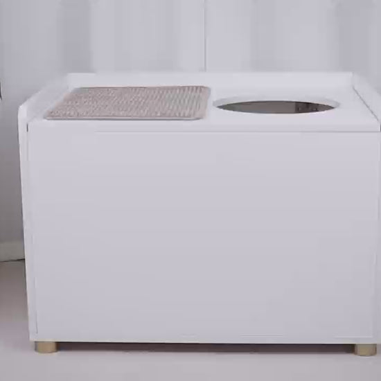 Keep your cat’s litter area clean, stylish, and discreet with the Amunrbrek Modern Litter Box Enclosure Cabinet. This dual-purpose piece hides your cat’s litter box while doubling as elegant furniture, available in Black or White finishes with golden accents. Designed with a built-in scratch mat, spacious interior, and front-entry access, it’s perfect for reducing litter mess and upgrading your home décor.
